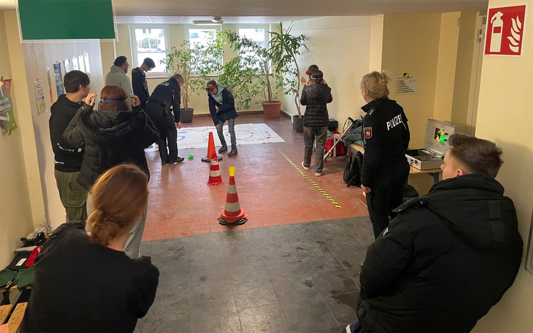 Die letzte Station befasste sich mit den Auswirkungen von Betäubungsmitteln und Alkohol auf unsere Wahrnehmung und Bewegungsfähigkeit. Mit Trunkenheitsbrillen einen Parcours zu durchlaufen ist gar nicht einfach! Mensch-ärger-dich-nicht ist kaum noch zu spielen, weil man an den Figuren vorbeigreift. Ein weiterer Reaktionstest rundete die umfangreiche Station ab. Frau Hitschfeld, Frau van der Wall und Herr Oehlmann (allesamt von der Polizei) betreuten die Station mit allen Kräften, da keine Person auf (zu große) Abwege geraten sollte und beim Reaktionstest nicht geschummelt werden sollte (bringt ja sonst keinen Lerneffekt). Der Atemalkoholtest war ein beliebtes Highlight (zum Glück waren alle Teilnehmenden bei 0,0 Promille!).