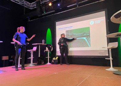 Eine weitere Station war der E-Scooter-Vortrag. Hier wurden spannende Fakten rund um den Umgang mit dem E-Scooter gegeben. Sicherlich war die eine oder andere Information gänzlich neu für die Zuhörinnen und Zuhörer. E-Scooter und Kraftfahrzeuge werden zum Beispiel bei Verkehrsverstößen gleichbehandelt, d.h. auch beim Fahren auf einem E-Scooter gilt die 0,0 Promille-Grenze! Sonst gibt es dieselben Punkte in Flensburg, wie beim Fahren anderer Fahrzeuge. Herr Oertelt von der Polizei konnte hier viel von seinen Erfahrungen auf Streife erzählen, war offen für jegliche Rückfrage der Teilnehmenden und gab zahlreiche Tipps dazu, wie die Fahrt mit dem Scooter sicher und voller Freude bleibt – selbst wenn man mal in eine Kontrolle geraten sollte.