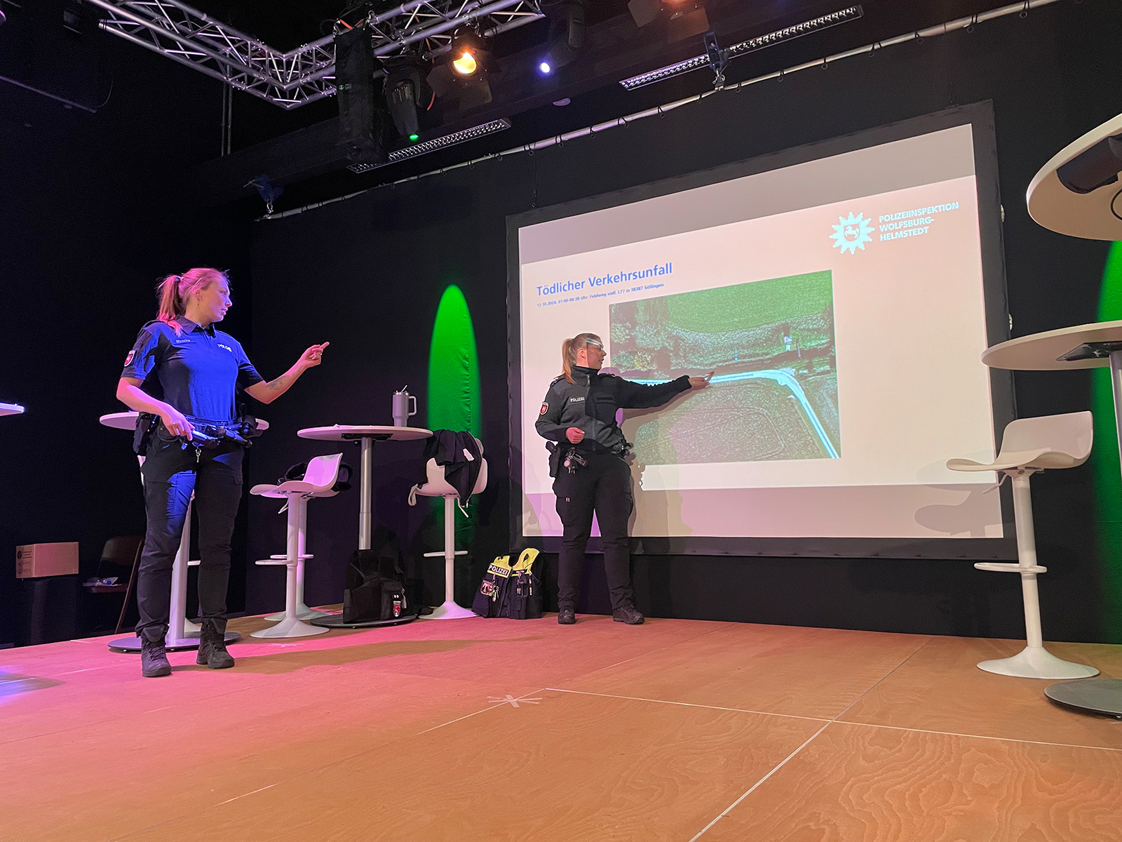 Im großen Hörsaal fand eine Unfall-Präsentation statt, die sich gänzlich um Vorfälle aus der Region WOB-HE drehte, die Menschenleben forderten. Mit Ton und Bild wurden manche Unfälle noch aufrüttelnder, als es die reinen Informationen hätten tun können. Doch die Präsentation enthielt neben den dramatischen Berichten auch umfangreiche Denkanstöße, wie die eigenen Fahrten sicher geplant und gestaltet werden können. Die jungen Polizistinnen Frau Esser und Frau Hoffmann fanden hierbei schnell den Zugang zu den teilnehmenden Schülerinnen und Schülern, wodurch sich z.T. ausgiebige, spannende Diskussionen entwickelten. Den Polizistinnen gelang das Einbinden der Zuhörerschaft insbesondere durch das Erzählen von eigenen Erfahrungen.