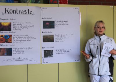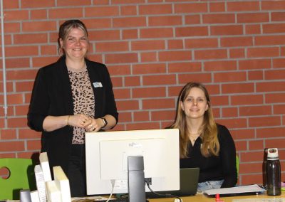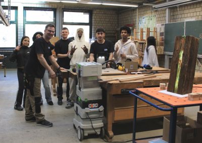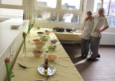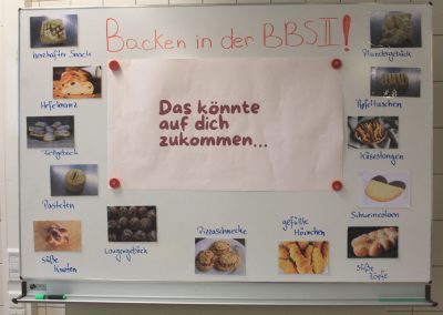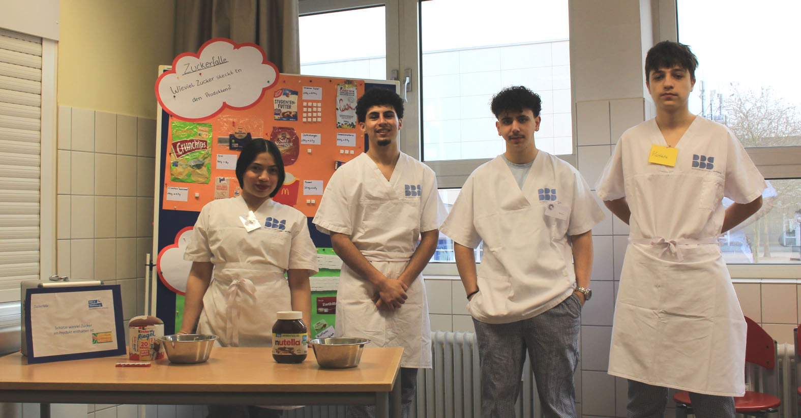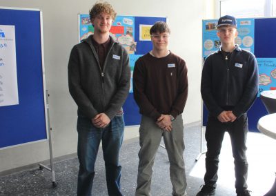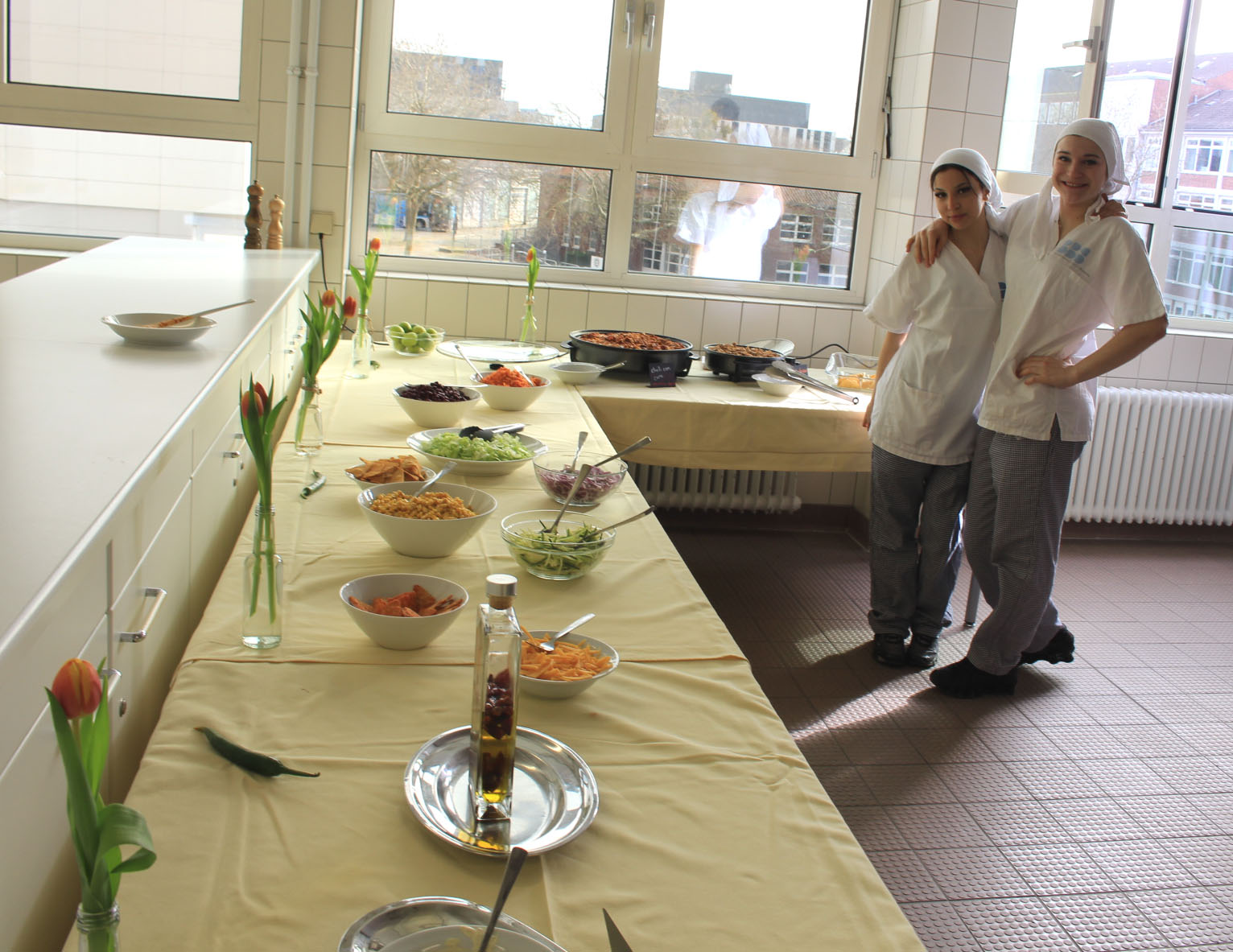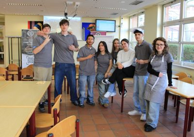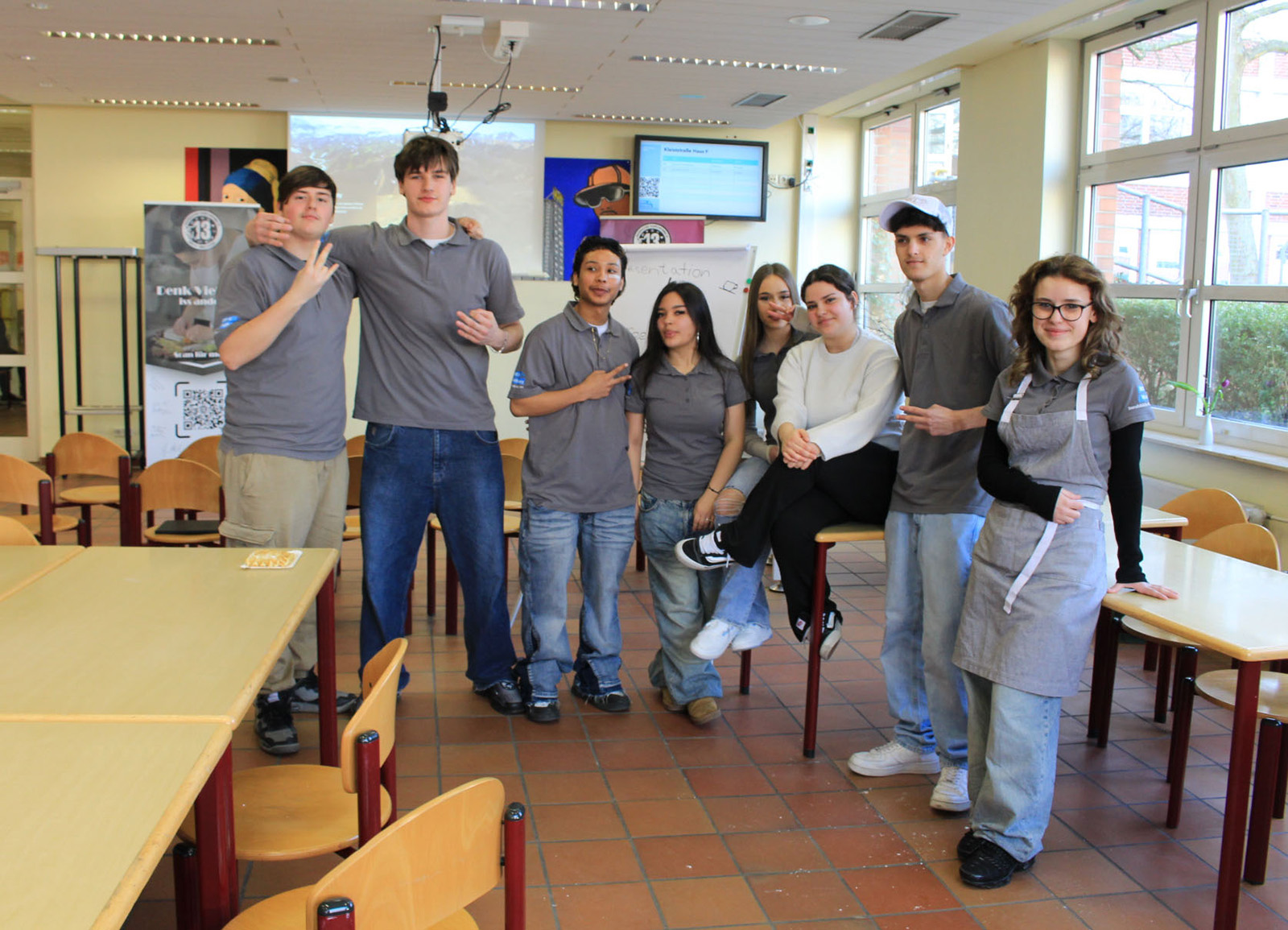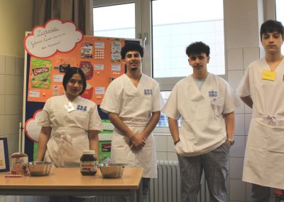 • Darüber hinaus konnten sich die Gäste im A-Gebäude über die Nachhaltige Schülerfirma 13 informieren: Die Schülerinnen und Schüler der Berufsfachschule Hauswirtschaft beschrieben in einer Präsentation das Aufgabenspektrum ihrer Tätigkeit vom Einkauf von Lebensmitteln, über die Herstellung von Speisen und dessen Verkauf in der Schulcafeteria bis hin zur Abrechnung der Betriebskosten u.v.m.
