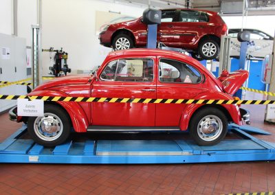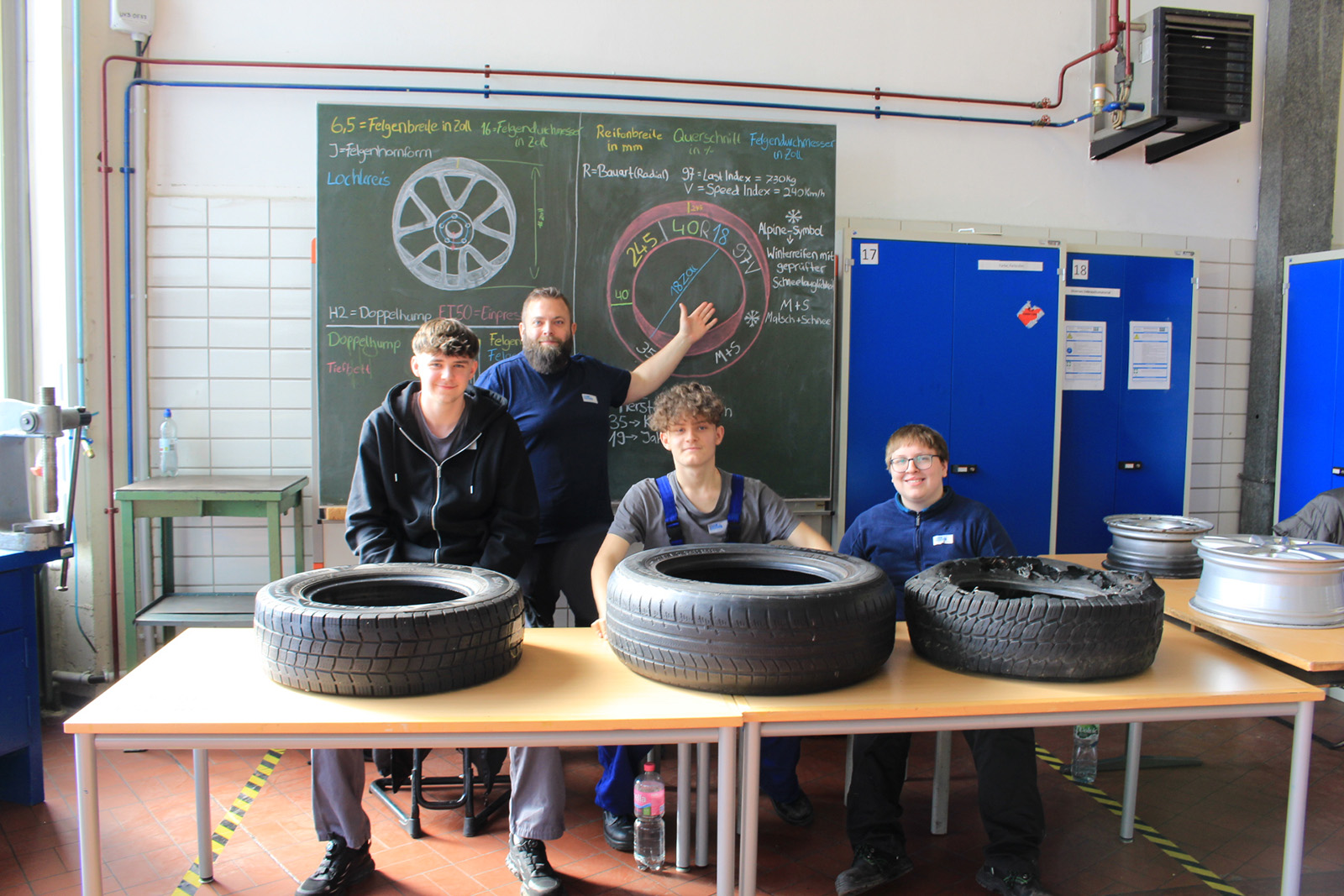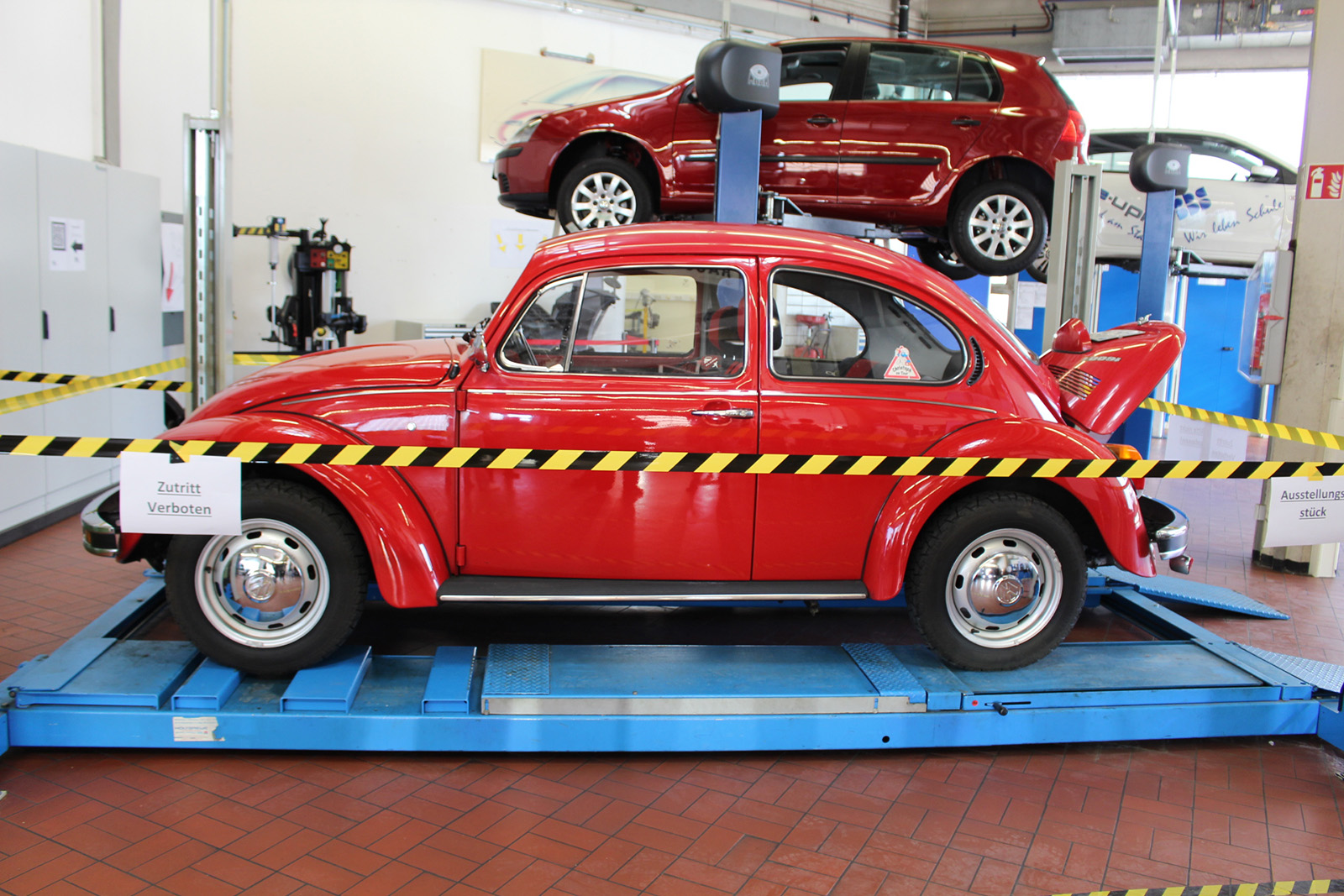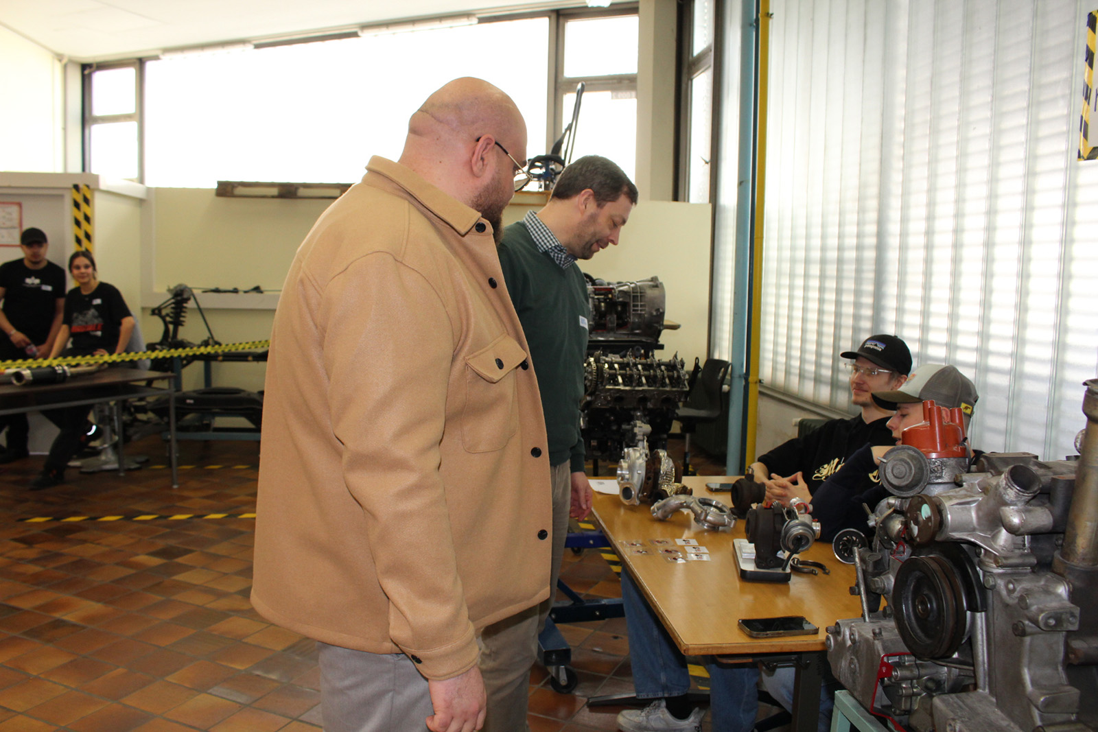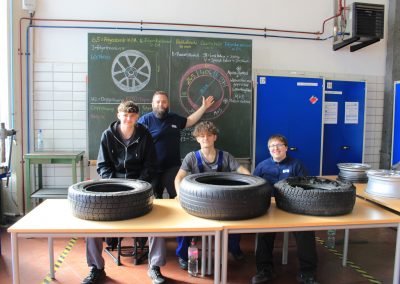• Im E-Gebäude stellte sich die Fahrzeugtechnik vor: In der Werkstatt erlebten die Besucher eine automobile Zeitreise von Hebebühne und VW-Automodellen von Käfer über Golf bis hin zum E-UP. Schülerinnen und Schüler der Berufsfachschule beschrieben Reifen und Felgenbezeichnungen sowie Montage und Schäden der Bereifung. Neben der Erklärung von Schulungsmotoren erlebten die Gäste u.a. die Verkabelung der Beleuchtungs- und Lichttechnik am Anhänger. Hinzu kam die Präsentation der Zerspanungsmechaniker/innen: Die Schülerinnen und Schüler der Berufsfachschule erklärten die Ergebnisse von Projekten, Werkstücke sowie Messmittel und führten die Besucher durch die Maschinenwerkstatt. Ergänzend zu den schulischen Aktivitäten stellten sich verschiedene Betriebe im Eingangsbereich vor.