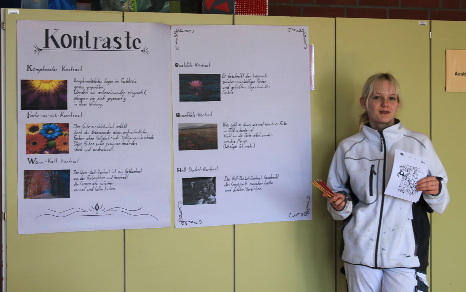 • In der Farbtechnik erhielten die Besucher zunächst durch Spiele und Mitmach-Aktionen Einblicke in die Farblehre. Auszubildende im Beruf Maler/in und Lackierer/in erklärten neben dem Farbsehen die Wirkung unterschiedlicher Hintergründe auf die Farbwirkung und Kontraste. Azubis im Beruf Fahrzeuglackierer/in beschrieben den Ablauf bei der Reparatur eines Lackschadens vom Ausbeulen über das Spachteln und Schleifen bis hin zum Lackauftrag mit Spritzpistolen.