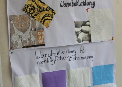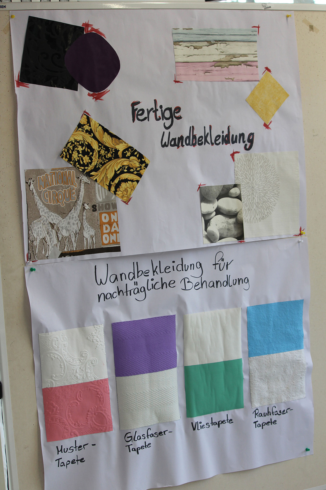• Die angehenden Raumausstatter/innen erklärten verschiedene Materialien der Wandgestaltung und führten ein Schautapezieren durch.