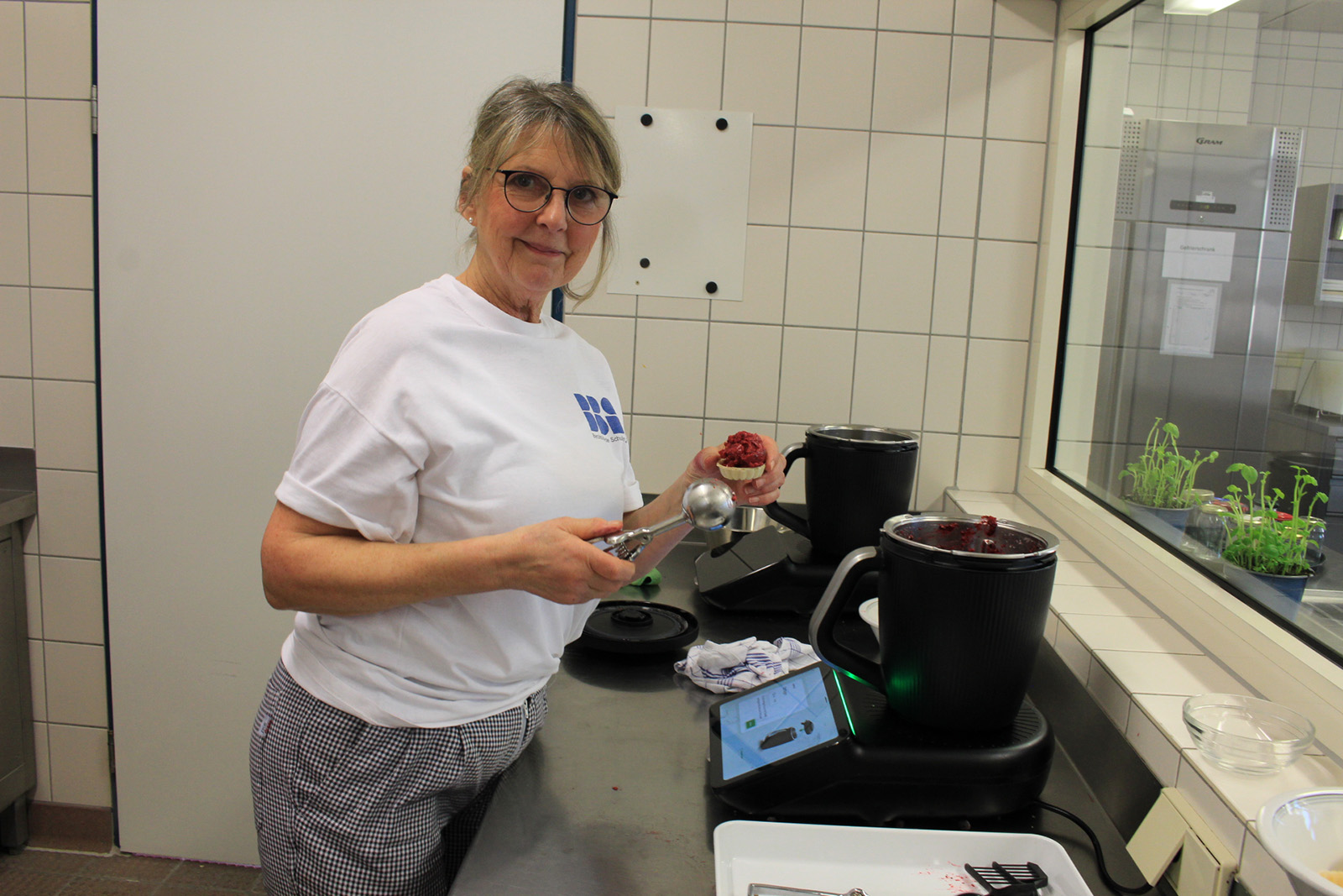 • Im B-Gebäude konnten die interessierten Besucher den Bereich der Hauswirtschaft bzw. Gastronomie kennenlernen: Zu Beginn spielten sie ein Kahoot-Wissensquiz. Dann folgte an einem Info-Stand die Gesundheitsprävention durch Aufklärung über den Zuckergehalt in Lebensmitteln durch die Schülerinnen und Schüler der Berufseinstiegsschule. Dann stellten die Gäste in der Restaurantküche selbst durch Schütteln eines Glases aus Sahne Butter her, welche dann mit Kräutern verfeinert wurde. Anschließend außen sie in Leerküche und Backstube von den Schülern selbst hergestellte Tacos, Laugengebäck und Pizza. Zum Abschluss gab es ein selbstgemachtes Frucht-Eis, das blitzschnell im Thermomix zubereitet wurde.